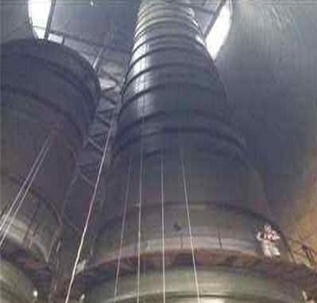 1)鋼煙囪施工采用優(yōu)質(zhì)鋼材:鋼板厚度為16㎜、長(zhǎng)度為20m、經(jīng)卷板機(jī)加工制作成直徑為1.4m的圓筒型、然后對(duì)所有縫口進(jìn)行內(nèi)外焊接、焊接時(shí),應(yīng)焊漿飽滿、無孔洞、表面光滑平整。