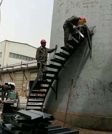 2、安裝:根據(jù)煙囪外壁的尺寸用φ20×20的膨脹螺絲在安裝平臺的地方先安裝墻板支撐點(diǎn)(作為旋轉(zhuǎn)梯的固定點(diǎn)),間距為300mm;然后將踏板焊接組成,再焊接立柱,扶手,護(hù)欄安裝,使旋轉(zhuǎn)梯形成一連體座;這樣就形成一整座旋轉(zhuǎn)梯。