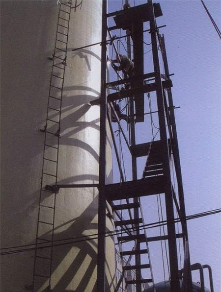 4、煙囪鋼結(jié)構(gòu)除銹:在底漆涂刷施工前,應(yīng)首先將煙囪附屬鋼結(jié)構(gòu)(包括爬梯、平臺、護網(wǎng)等)需要涂刷部位的浮銹、灰塵等清理干凈才能進行防銹油漆的涂刷。除銹質(zhì)量的保證在該工程施工中尤為重要。根據(jù)煙囪現(xiàn)場情況同時為了保證涂刷質(zhì)量具體采用人工除銹的方法,運用鏟刀、砂布、鋼絲刷等除銹工具進行手工除銹,清除煙囪爬梯、平臺、護網(wǎng)上的鐵銹、灰塵等沾附物。