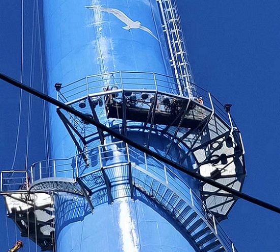 4、對煙囪安裝爬梯踏步板、平臺及欄桿等焊接處進行除銹防腐刷油漆。 5、實施煙囪安裝旋轉梯時還要注意旋轉的高度和角度,以防尺寸出現(xiàn)誤差。